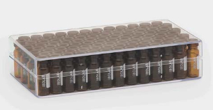 - The glass clear polystyrene box makes the vials allways visible at all times.